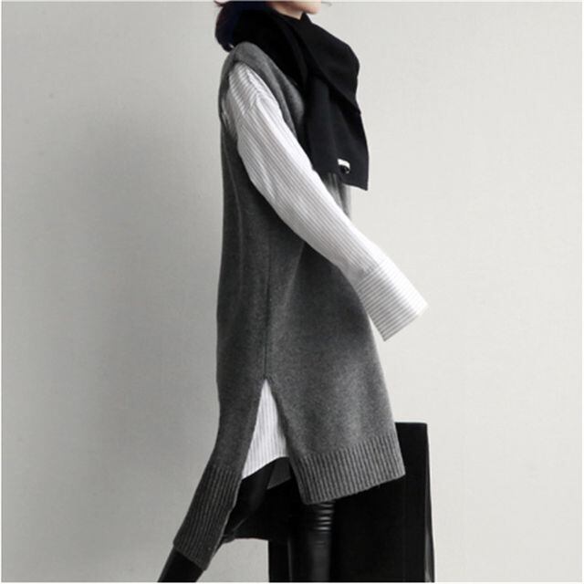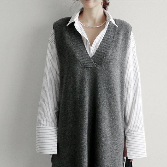 【予約販売】ニットベストワンピース ロング丈 Vネック ノースリーブ ブラック グレー ナチュラル きれいめ 秋冬 ワンピ 大人可愛い カジュアル おしゃれ こなれ感 韓国 S/M/L