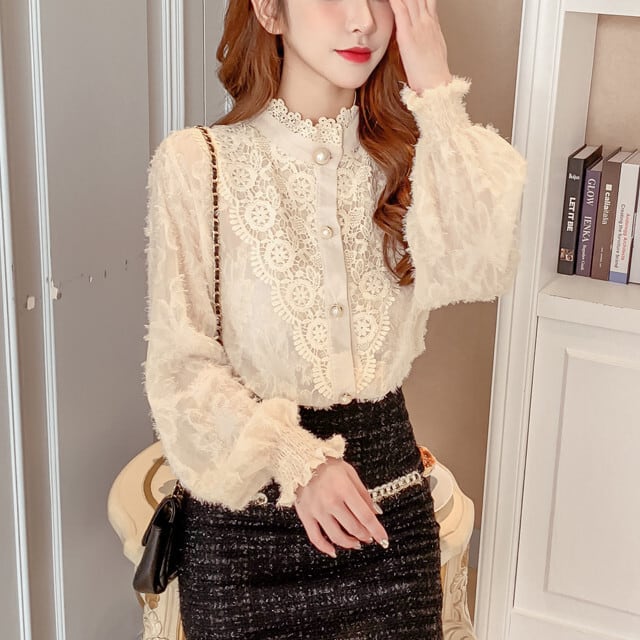 全3色 レディース ブラウス シャツ クラシカル フラワーレース シースルー シアー フリル ブラック/ベージュ/ホワイト S/M/L/XL/2XL