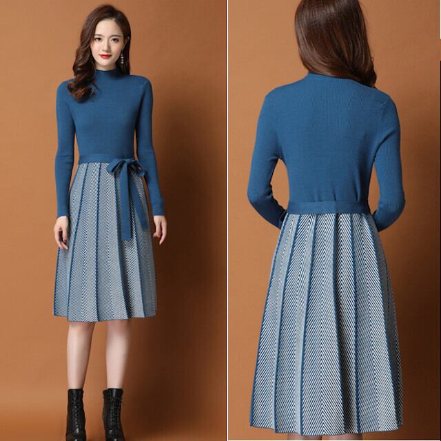 全5色 レディース ワンピース ニットワンピ ちびハイ ハイネック プリーツ 膝丈 リボン ブラック/ベージュ/ブルー/キャメル/モカ 大きいサイズ M/L/XL/2XL/3XL