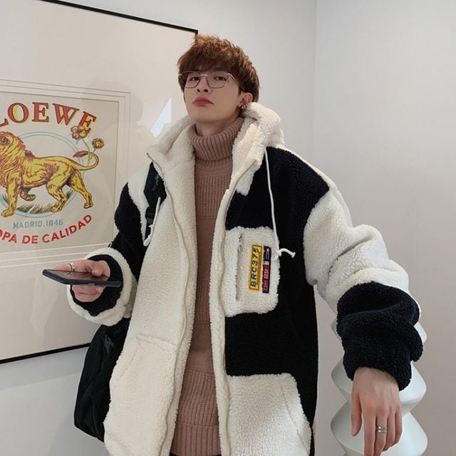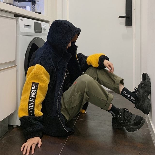【予約販売】ボアジャケット アウター フード付き バイカラー 切り替え 厚手 メンズ イエロー ホワイト 防寒 お洒落 カジュアル ベーシック 秋冬 大きいサイズ S/M/L/XL/2XL/3XL/4XL/5XL