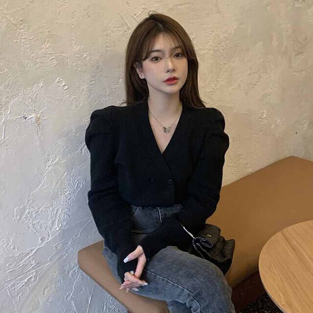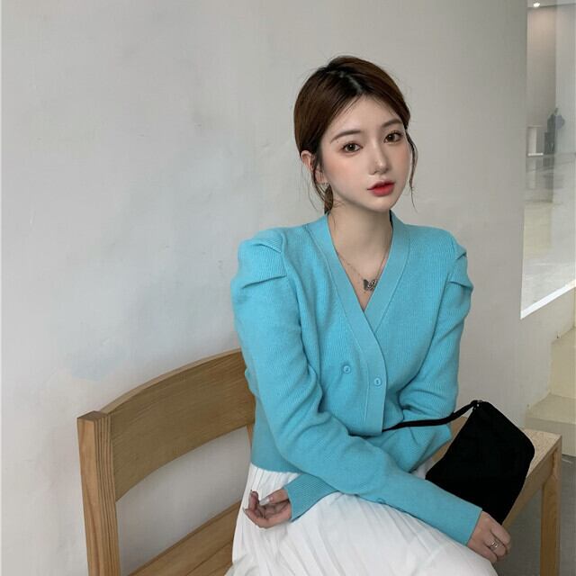 全2色 レディース ニット カーディガン パフショルダー ダブルボタン ショート丈 無地 シンプル おしゃれ S/M ブラック/ブルー