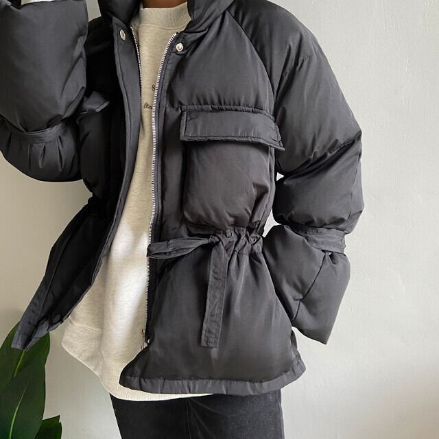 全3色 レディース ダウンジャケット アウター ミディアム丈 キャンディースリーブ ウエストリボン ウエストマーク あったか 秋冬 ブラック/ブルー/アプリコット