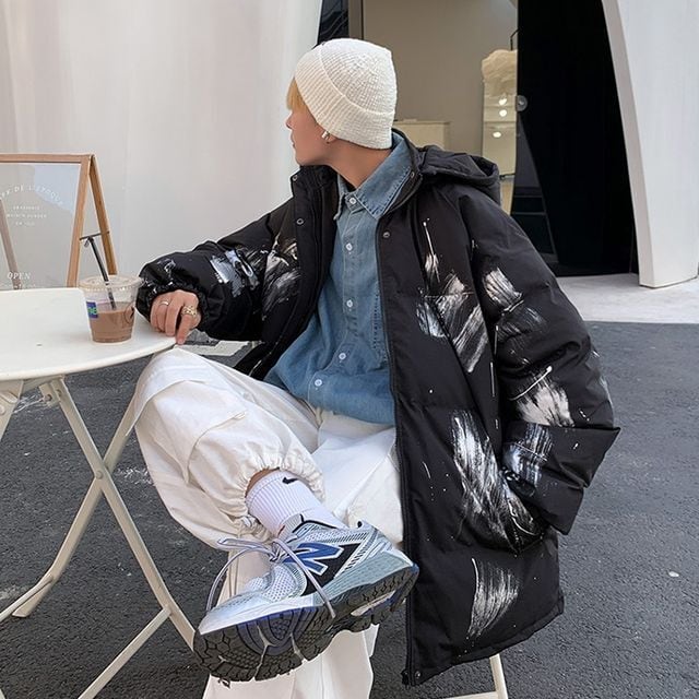 【予約販売】ダウンジャケット ペイント フード付き ストリート ショート丈 ブラック ベージュ 防寒 お洒落 カジュアル 秋冬 大きいサイズ M/L/XL