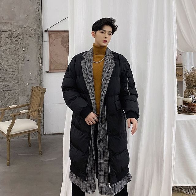 【予約販売】ダウンコート 重ね着風 アウター チェック柄 チェスター ロング丈 ブラック ホワイト 防寒 お洒落 カジュアル 秋冬 大きいサイズ M/L/XL