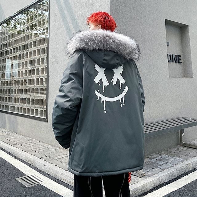 【予約販売】ロングダウンコート アウター バッグプリント ミディアム丈 メンズ ファーフード付き ブラック グレー 防寒 お洒落 こなれ感 ベーシック 秋冬 大きいサイズ M/L/XL/2XL/3XL/4XL/5XL