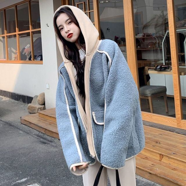【予約販売】ボアジャケット レディース ショート丈 重ね着風 フード付き レイヤード カジュアル 秋冬 アウター おしゃれ こなれ感 韓国 S/M/L/XL