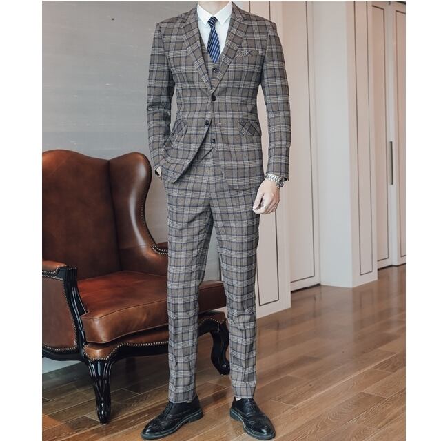 【予約販売】メンズ スーツ ベスト 3点セット チェック柄 スリーピース ジャケット パンツ セット セットアップ パーティ 二次会 同窓会 結婚式 韓国 トレンド S/M/L/XL/2XL/3XL/4XL/5XL