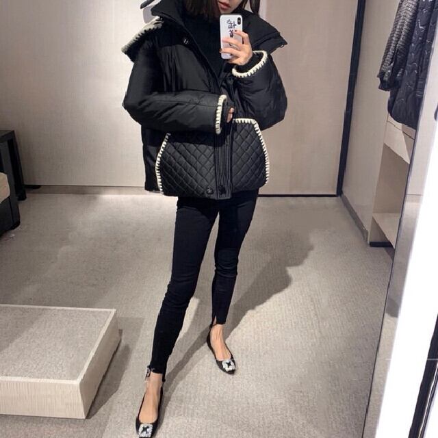 レディース アウター ダウン キルティング デザインダウンジャケット フード付 ロゴ かっこいい かわいい おしゃれ 秋冬 ブラック S/M/L