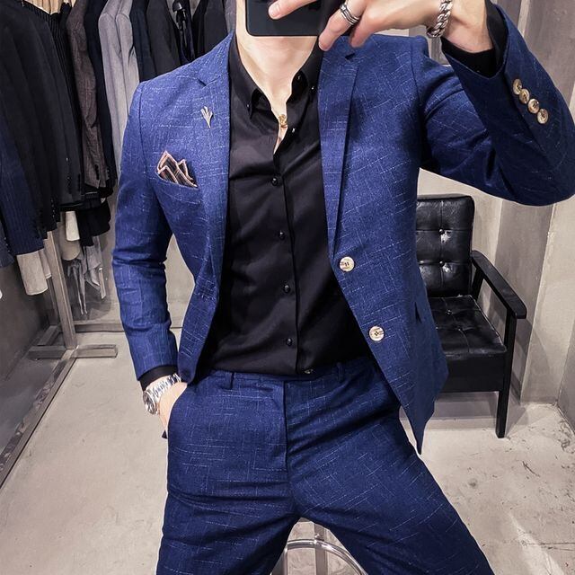 【予約販売】メンズ スーツ 総柄 ブラック ブルー シック 男前 ジャケット パンツ セット セットアップ パーティ 二次会 同窓会 結婚式 韓国 トレンド M/L/XL/2XL/3XL