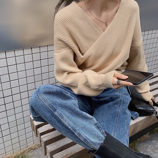 全3色 レディース トップス ニット セーター ゆるニット クロス オフショルダー ウール アイボリー/グレー/コーヒー