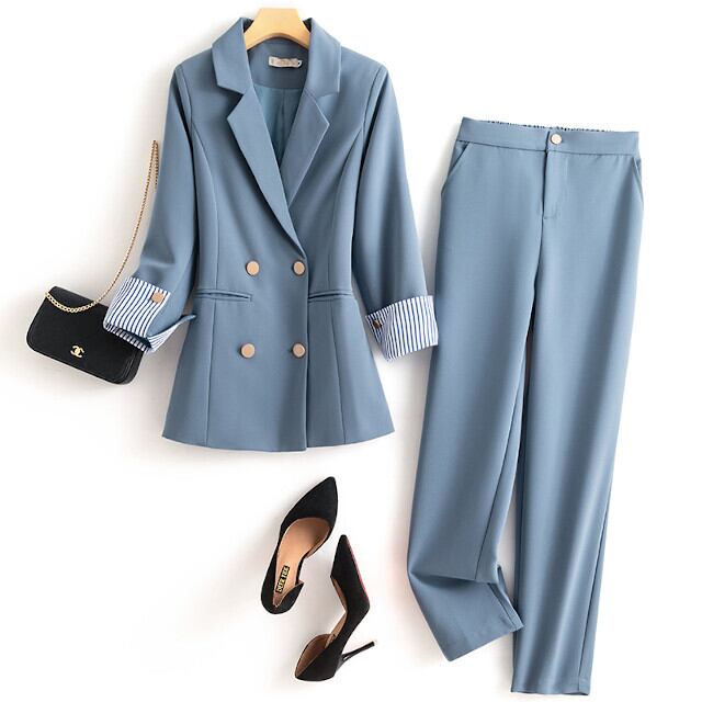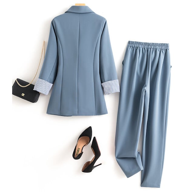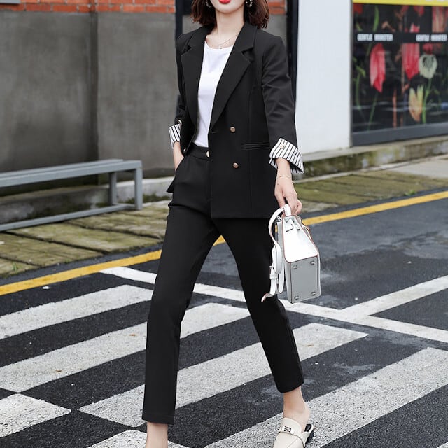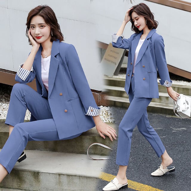 全3色 2点セット レディース スーツ 金Wボタン 折返し袖 テーラード襟ジャケット&パンツ セットアップ 長袖 ストライプ ブラック/ブルー/ピンク S/M/L/XL