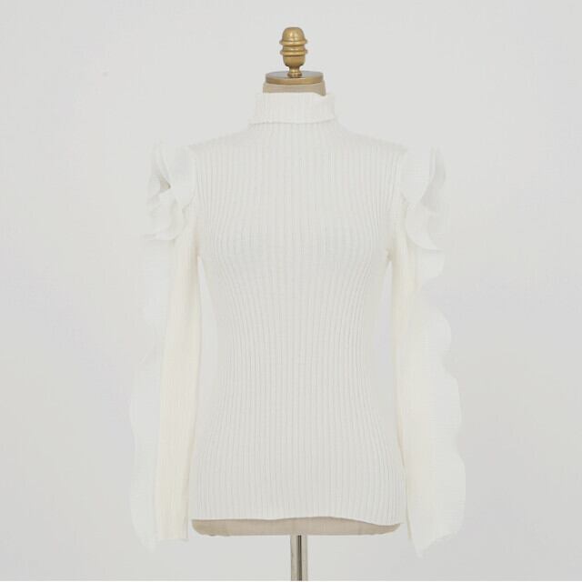 全2色 レディース フリルスリーブ 袖コンシャス ハイネック ニット リブニット 無地 肌見せ 大人可愛い モテ セクシー ブラック/ホワイト