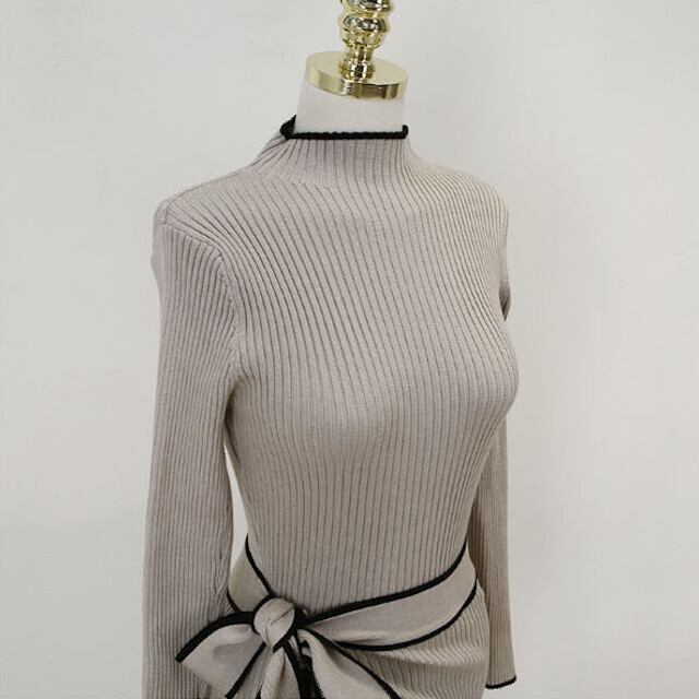 全2色 レディース ワンピース ウエストリボン ツートンカラー ハイネック バイカラー スリム リブニット タイト 膝下丈 上品 デート お呼ばれ ベージュ/ブラック