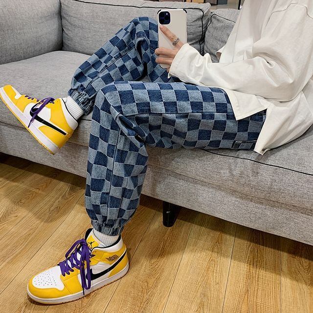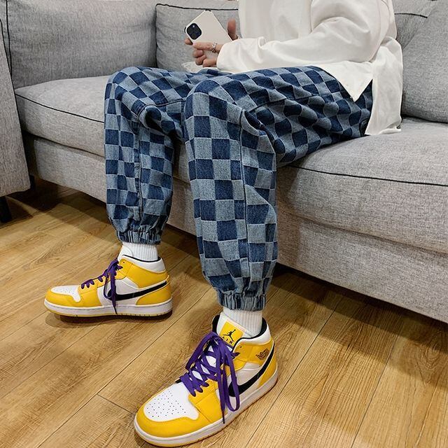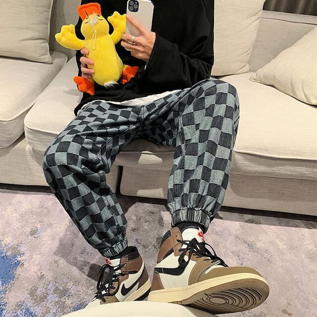 【予約販売】ジョガーパンツ カーゴパンツ ボトムス デニム チェック柄 メンズ ブラック ネイビー シック カジュアル こなれ感 お洒落 韓国 トレンド 秋冬春 M/L/XL/2XL/3XL/4XL/5XL