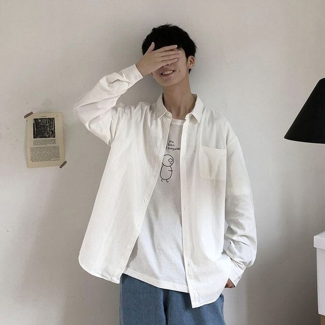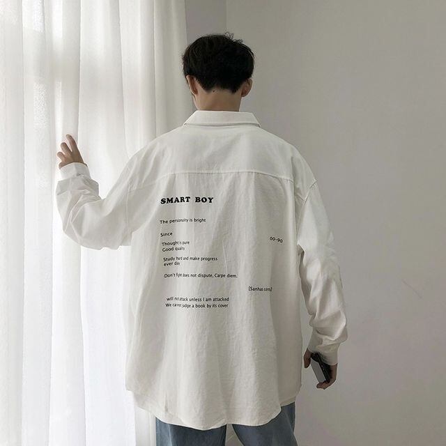 【予約販売】シャツ 長袖 メンズ バッグプリント ブラック ホワイト シック こなれ感 お洒落 韓国 トレンド 春 M/L/XL/2XL