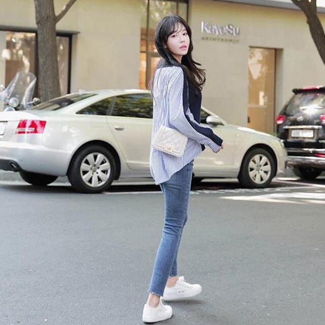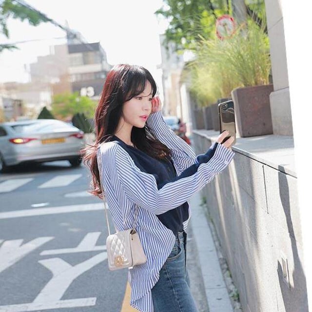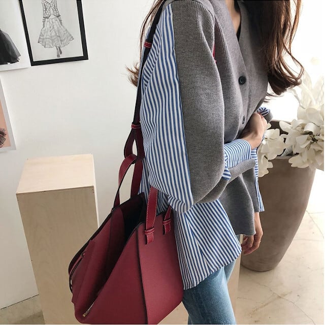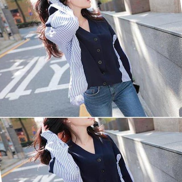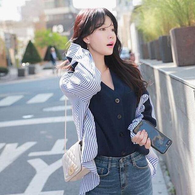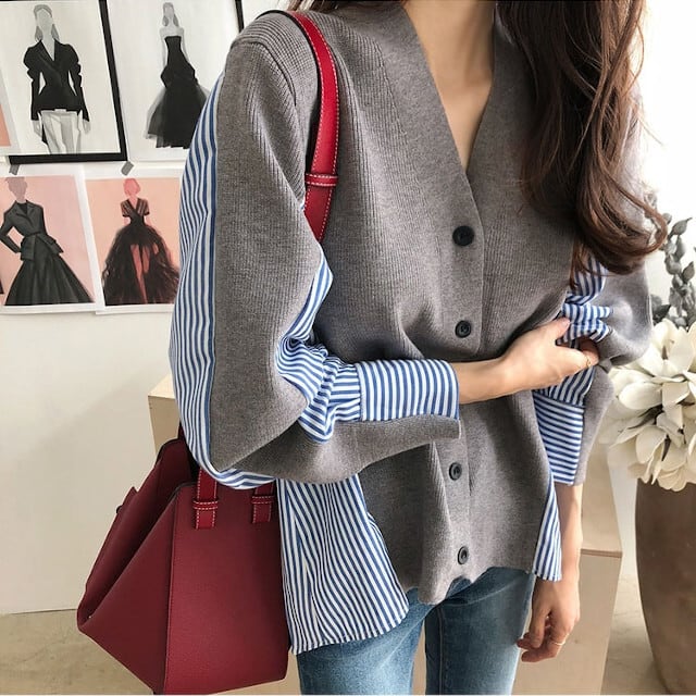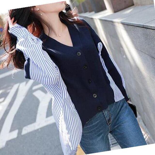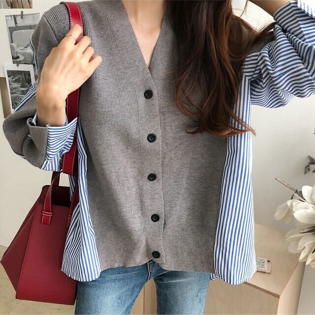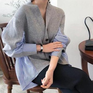全2色 レディース カーディガン ストライプ シャツ切替 異素材ミックス Vライン 長袖 ニット グレー/ネイビー S/M/L/XL