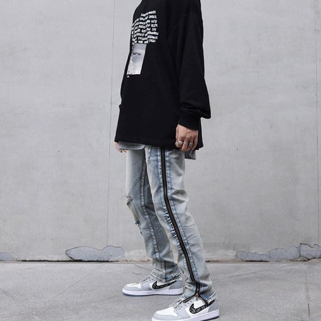 【予約販売】デニム メンズ ストレッチデニム ブルー ダメージ サイドジップ ウォッシュ カジュアル こなれ感 お洒落 韓国 トレンド 春 S/M/L/XL/2XL