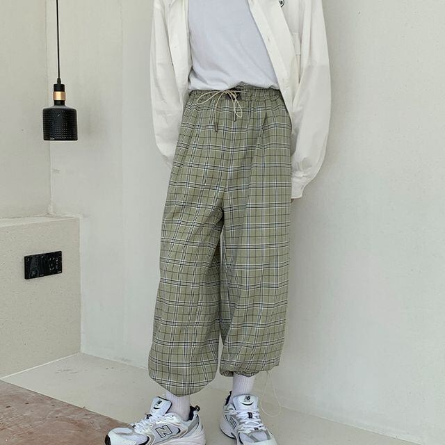【予約販売】ルーズパンツ メンズ パンツ チェック柄 ワイド ウエストゴム カジュアル こなれ感 お洒落 韓国 トレンド 春 M/L/XL/2XL
