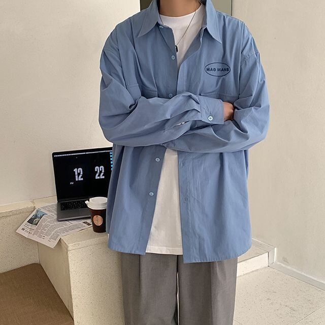 【予約販売】シャツ 長袖 メンズ 胸ロゴ ブルー シンプル シック こなれ感 お洒落 韓国 トレンド 春 M/L/XL/2XL