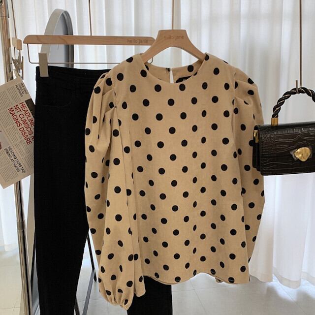 レディース トップス ブラウス パワーパフショルダー パフスリーブ ドット おしゃれ かわいい ワンサイズ