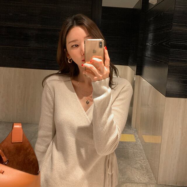 全4色 アイボリー/ピンク/グリーン/ブラック レディース トップス カシュクール Vライン ウエストリボン リブニット S/M/L/XL/2XL