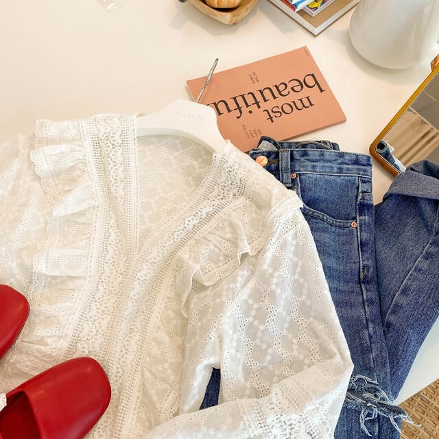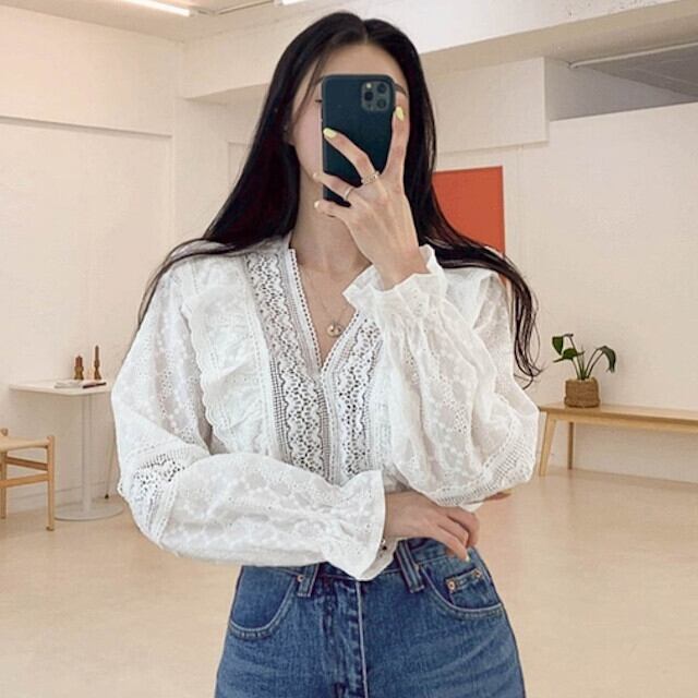 レディース ブラウス パンチングレース Vネック ブラウス ホワイト サイズ展開豊富 S/M/L/XL/2XL 春秋