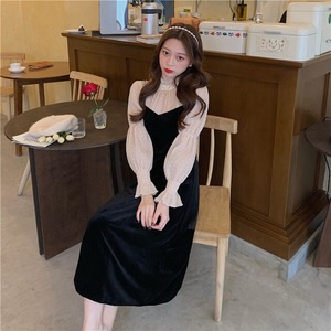 レディース ワンピースドレス 上品 レイヤード風 ラッフルカフス ひざ丈ワンピース ミモレ丈 レース ブラック