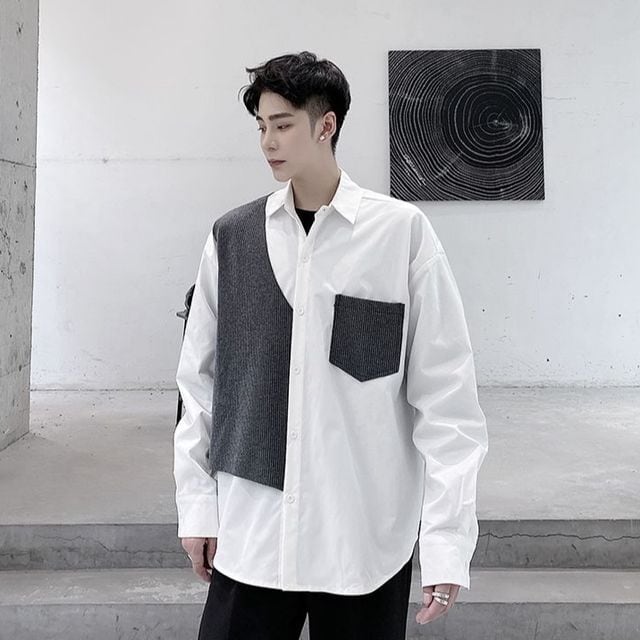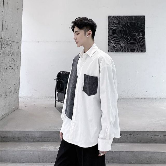 【予約販売】シャツ 長袖 メンズ モノトーン異素材MIX モノトーン ブラック ホワイト シック こなれ感 お洒落 エレガント 韓国 トレンド 春 M/L/XL