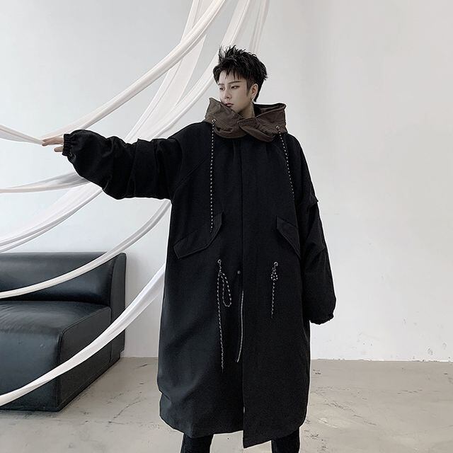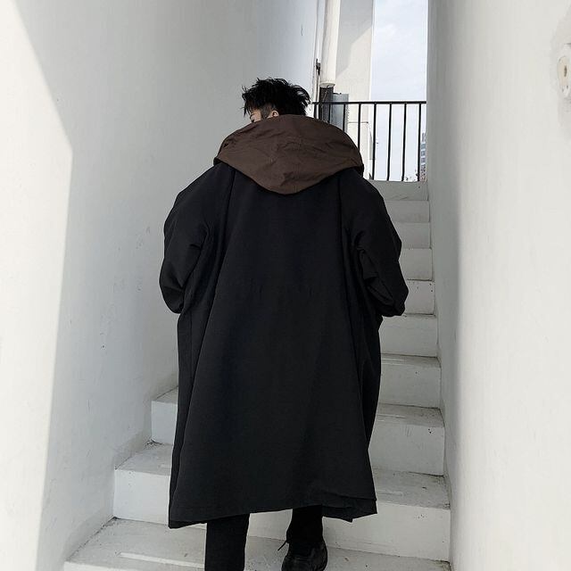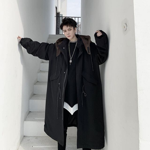 【予約販売】スプリングコート ロング丈 春 アウター メンズ ブラック フード付 カジュアル こなれ感 お洒落 韓国トレンド 春 秋 M/L/XL