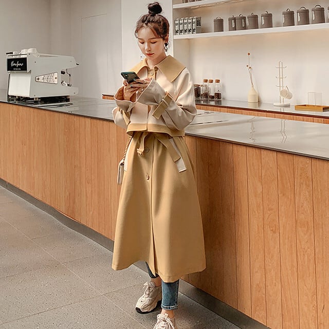 S/M/L/XL レディース トレンド バイカラー デザイントレンチコート ベージュ ロング丈 春秋