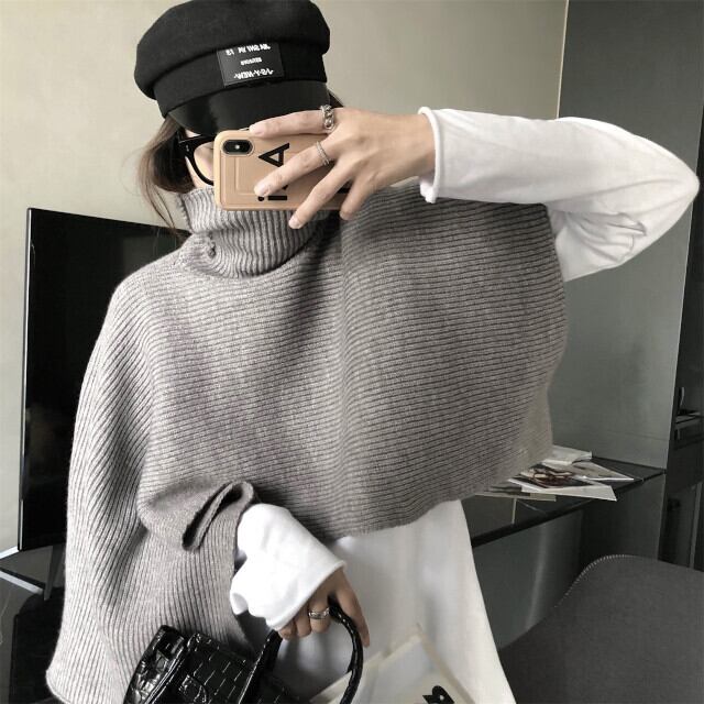 全3色 グレー/ブラック/ベージュ レディース ハイネック ポンチョ ケープ アシメントリー ニット 変形トップス