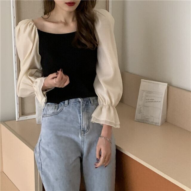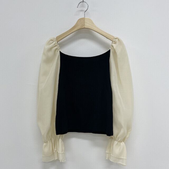 ニットとシアーな袖の異素材mixが