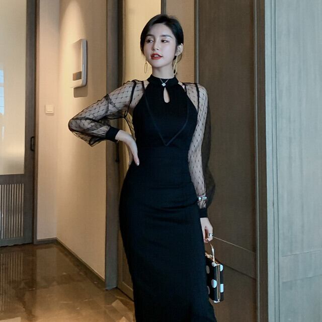 S/M/L レディース ワンピースドレス シースルー レース 光沢 ブラック アメリカンスリーブ ハイネック タイト ミディアム丈 膝下丈 パーティー 結婚式 謝恩会
