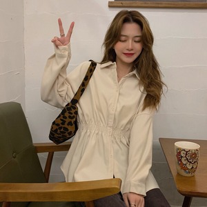 全2色 ベージュ/ブラック レディース ブラウス シャーリング ウエストマーク 襟付き 長袖 春秋 カジュアル
