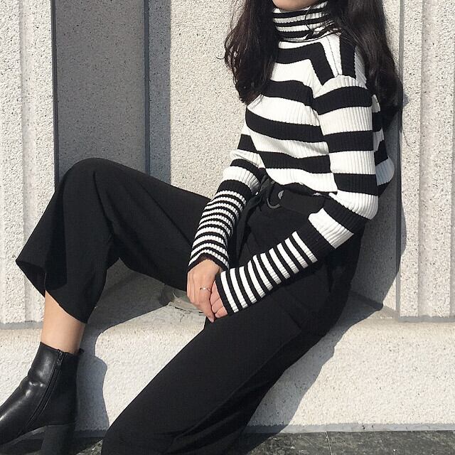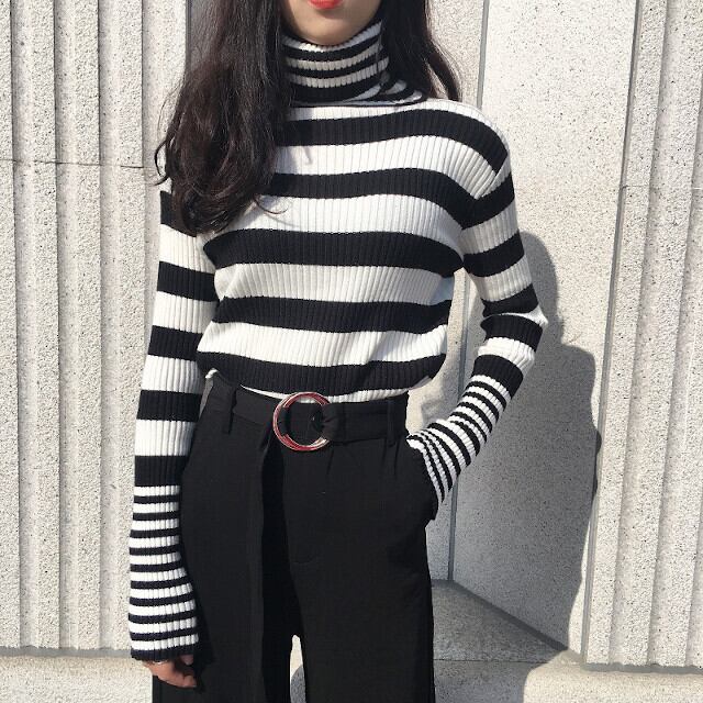 全4色 レディース トップス タートルネック ストライプ リブニット 長め袖 ホワイト×ブラック/グリーン/ブラウン