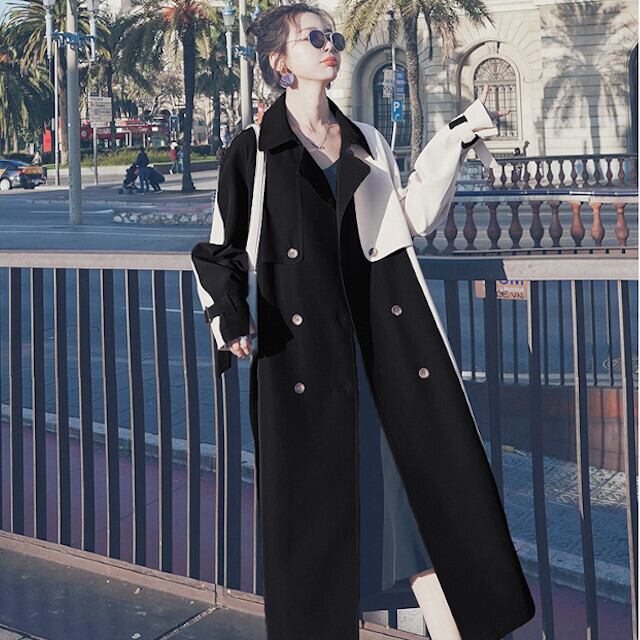 全2色 ブラック/コーヒー レディース アウター トレンチコート コントラストカラー バイカラー ロング丈 S/M/L/XL