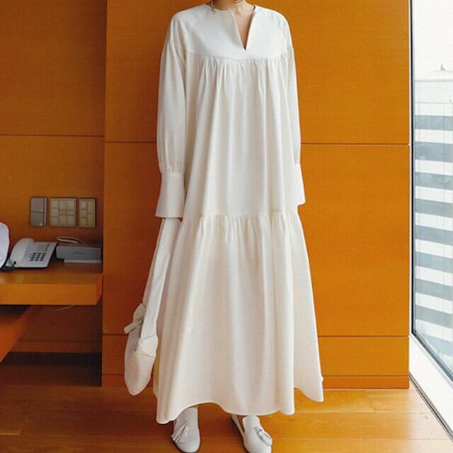 全2色 ホワイト/ブラック レディース ティアード カフス袖 ロングワンピース 無地 Vネック S/M/L/XL