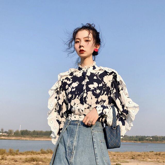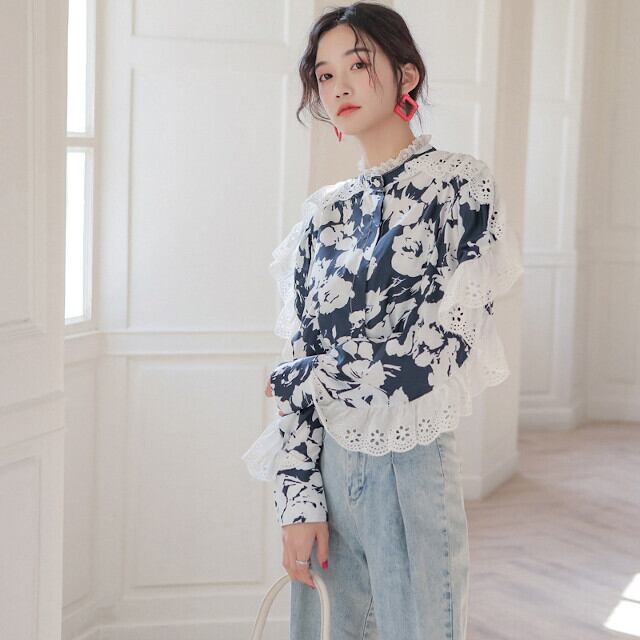 レディース 長袖 ブラウス 花柄 総柄 レース フリル スタンドカラー バイカラー ブルー おしゃれ 春秋 S/M/L