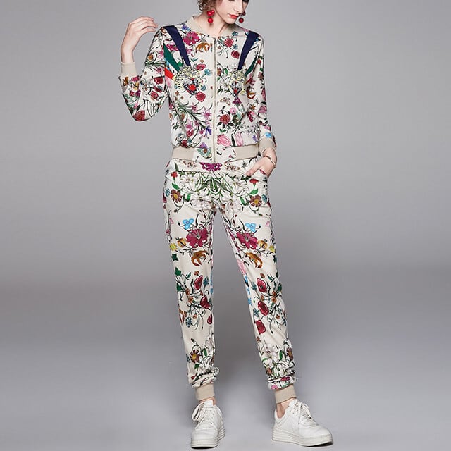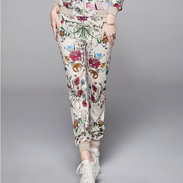 M/L/XL/2XL レディース セットアップ 2ピース スーツ ロゴ タイガー スウェット シフォン 長袖 花柄 フラワープリント