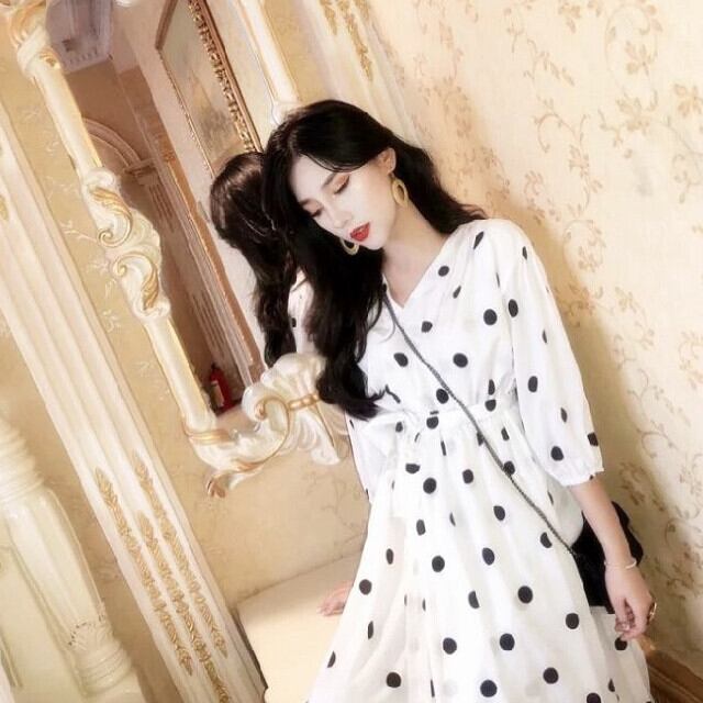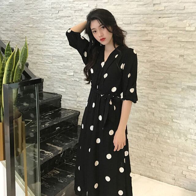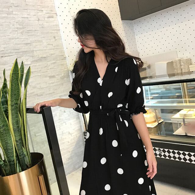 全2色 ブラック/ホワイト レディース ロングワンピース ドット リボン 水玉 膝下丈 カシュクール ワンピースドレス Vネック M/L/XL/2XL