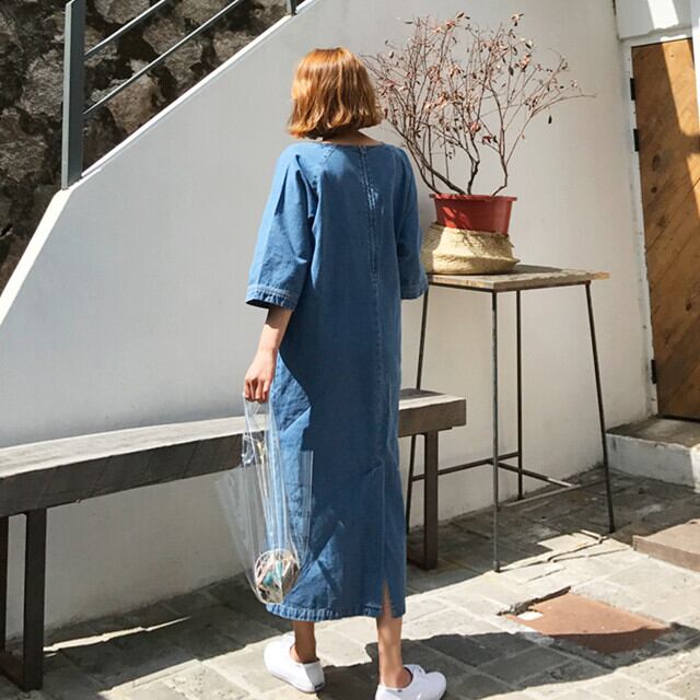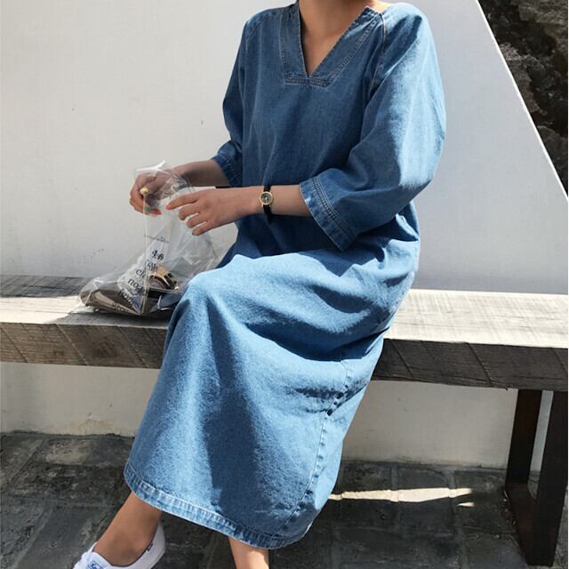 S/M/L/XL レディース ワンピース デニム 七分袖 マキシ丈 ミモレ丈 ロング丈 カジュアル 春秋 オーバーシルエット ゆったり