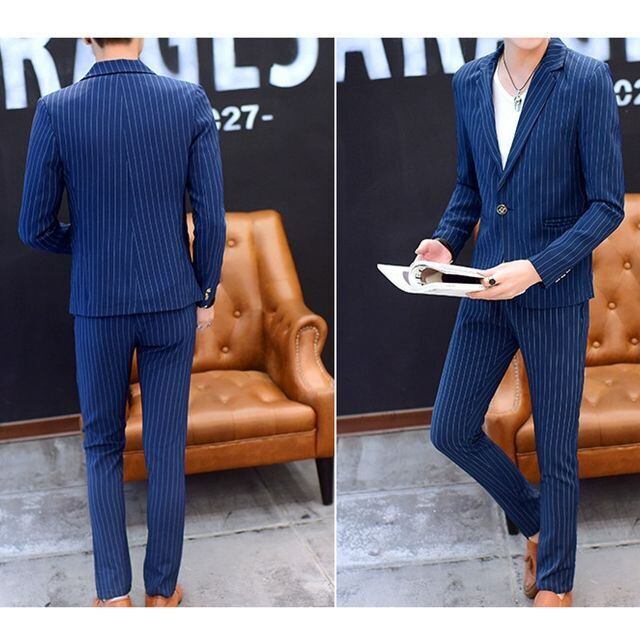 【予約販売】メンズ スーツ ストライプ柄 ブラック ブルー ホワイト シック 男前 ビジネス ジャケット パンツ セット セットアップ パーティ 二次会 同窓会 結婚式 韓国 トレンド M/L/XL/2XL/3XL