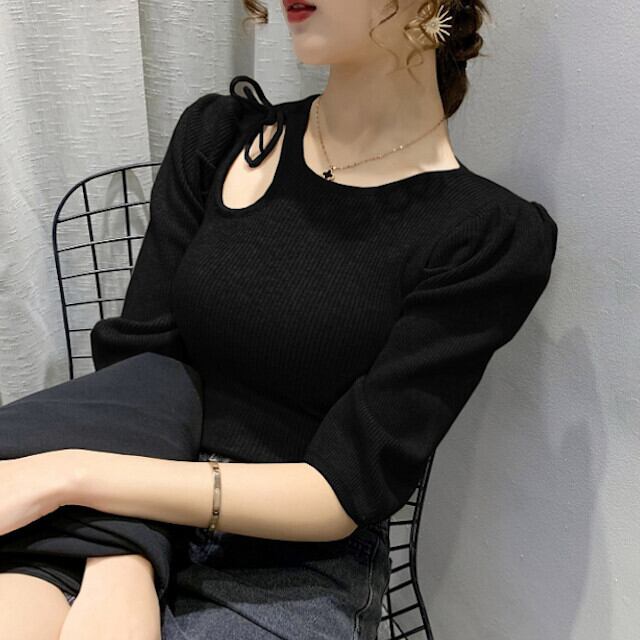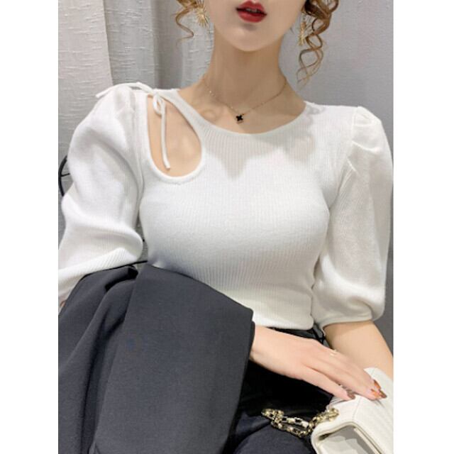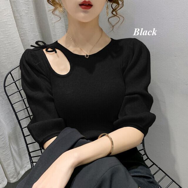 全4色 レディース トップス サークルスリット パフスリーブ 半袖 サマーニット 春秋 S/M/L/XL オートミール/ホワイト/ベージュ/ブラック