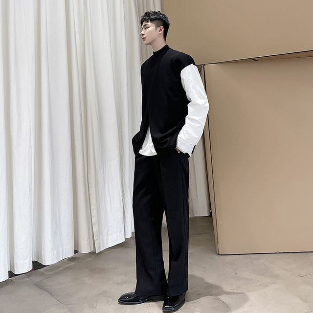 【予約販売】ロンT トップス 長袖 メンズ シャツ レイヤード 重ね着風 ブラック ゆったり カジュアル こなれ感 お洒落 韓国 トレンド 春 M/L/XL