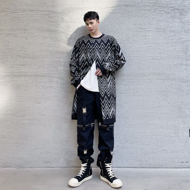 【予約販売】トップス ロング丈 メンズ スリット 幾何学模様 長袖 ブラック ゆったり カジュアル こなれ感 お洒落 韓国 トレンド 春 M/L/XL