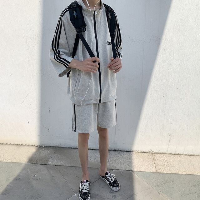 【予約販売】メンズ セットアップ 上下 半袖 ハーフパンツ ラインブラック グレー ブルー 部屋着 ジム スポーツウエア カジュアル 春 夏 大きいサイズ M/L/XL/2XL/3XL