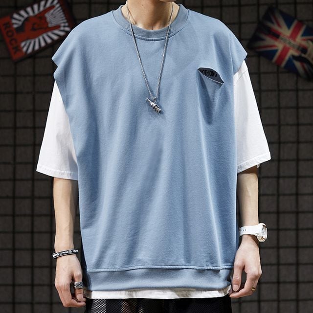 【予約販売】 トップス 半袖 メンズ Tシャツ レイヤード 重ね着風 バックロゴ ブラック グレー ブルー グリーン ゆったり カジュアル こなれ感 お洒落 韓国 トレンド 春 M/L/XL/2XL