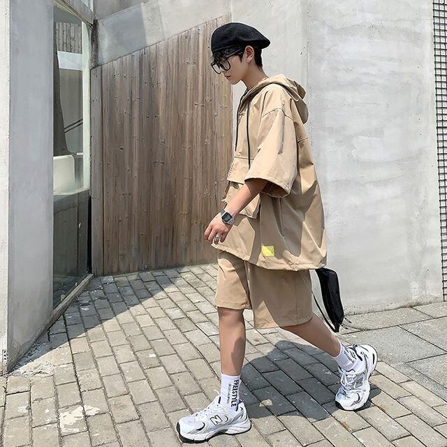 【予約販売】メンズ セットアップ 上下 ハーフパンツ フード付き パーカー ブラック ベージュ 半袖 ストリート ジム スポーツウエア カジュアル 春夏 M/L/XL/2XL