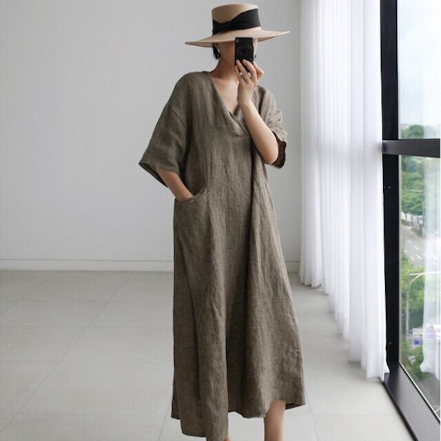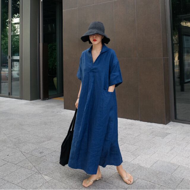 全3色 カーキ/ブルー/ブラウン レディース ロングワンピース スキッパー オーバーシルエット カジュアル スリット 袖あり S/M/L/XL