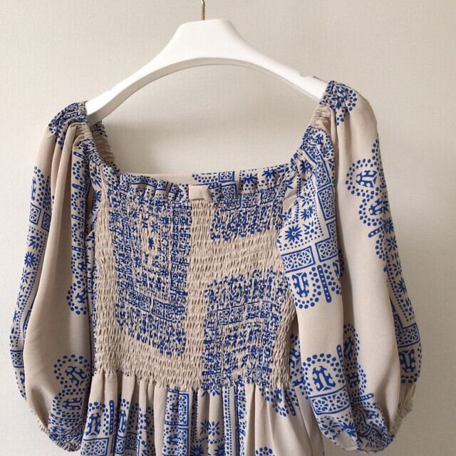 S/M/L レディース ワンピース ボリュームスリーブ パフスリーブ レトロ 花柄 ペイズリー柄 フレア ロング丈 ブルー